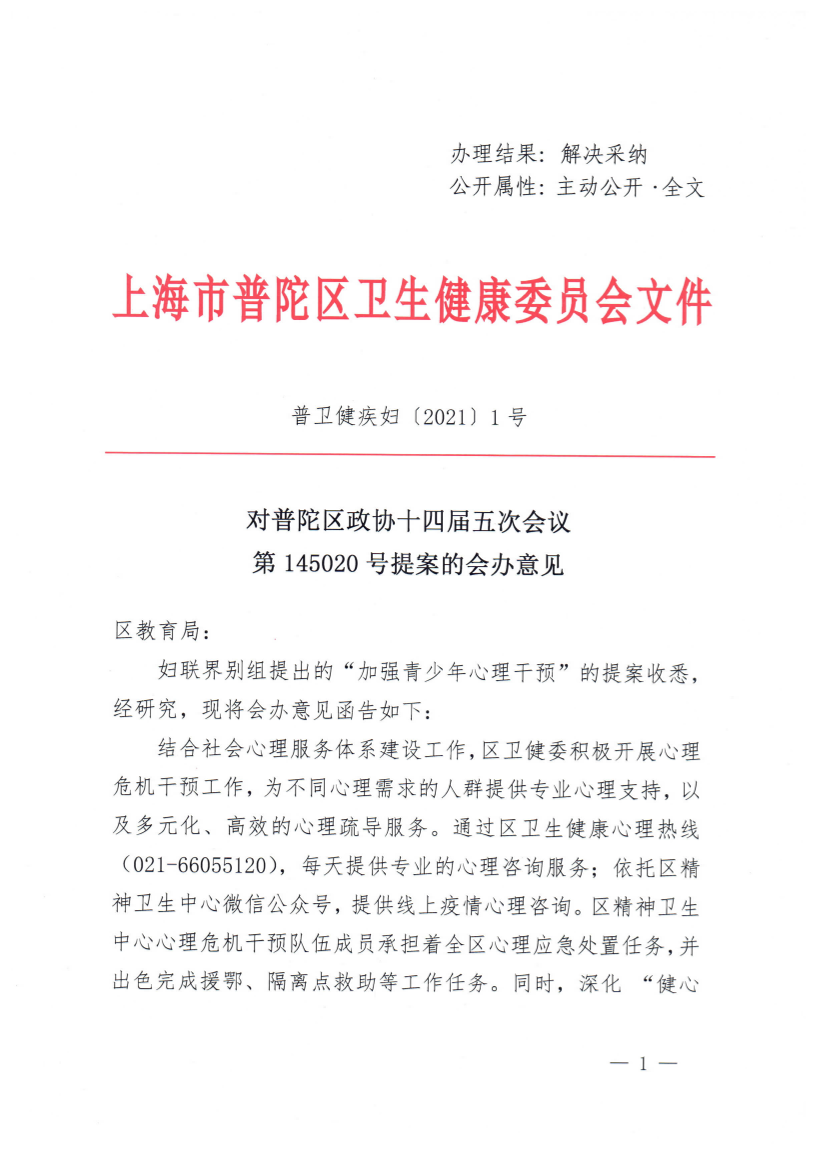 妇联界别组提出的“加强青少年心理干预”的提案收悉,经研究,现将会办意见函告如下: