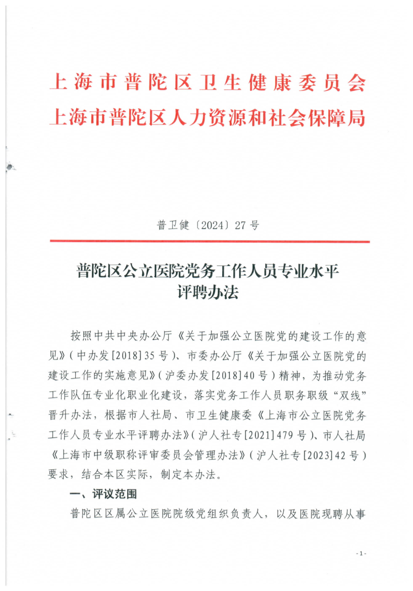按照中共中央办公厅《关于加强公立医院党的建设工作的意见》(中办发[2018]35号)、市委办公厅《关于加强公立医院党的建设工作的实施意见》(沪委办发[2018]40号)精神,为推动党务工作队伍专业化职业化建设,落实党务工作人员职务职级“双线”晋升办法,根据市人社局、市卫生健康委《上海市公立医院党务工作人员专业水平评聘办法》(沪人社专[2021]479号)、市人社局《上海市中级职称评审委员会管理办法》(沪人社专[2023]42号)要求,结合本区实际,制定本办法。