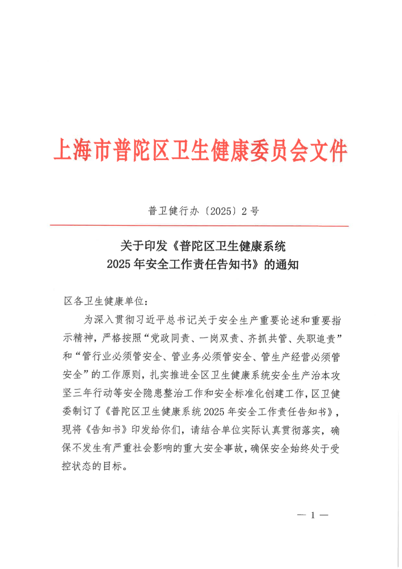 关于印发《普陀区卫生健康系统2025年安全工作责任告知书》的通知