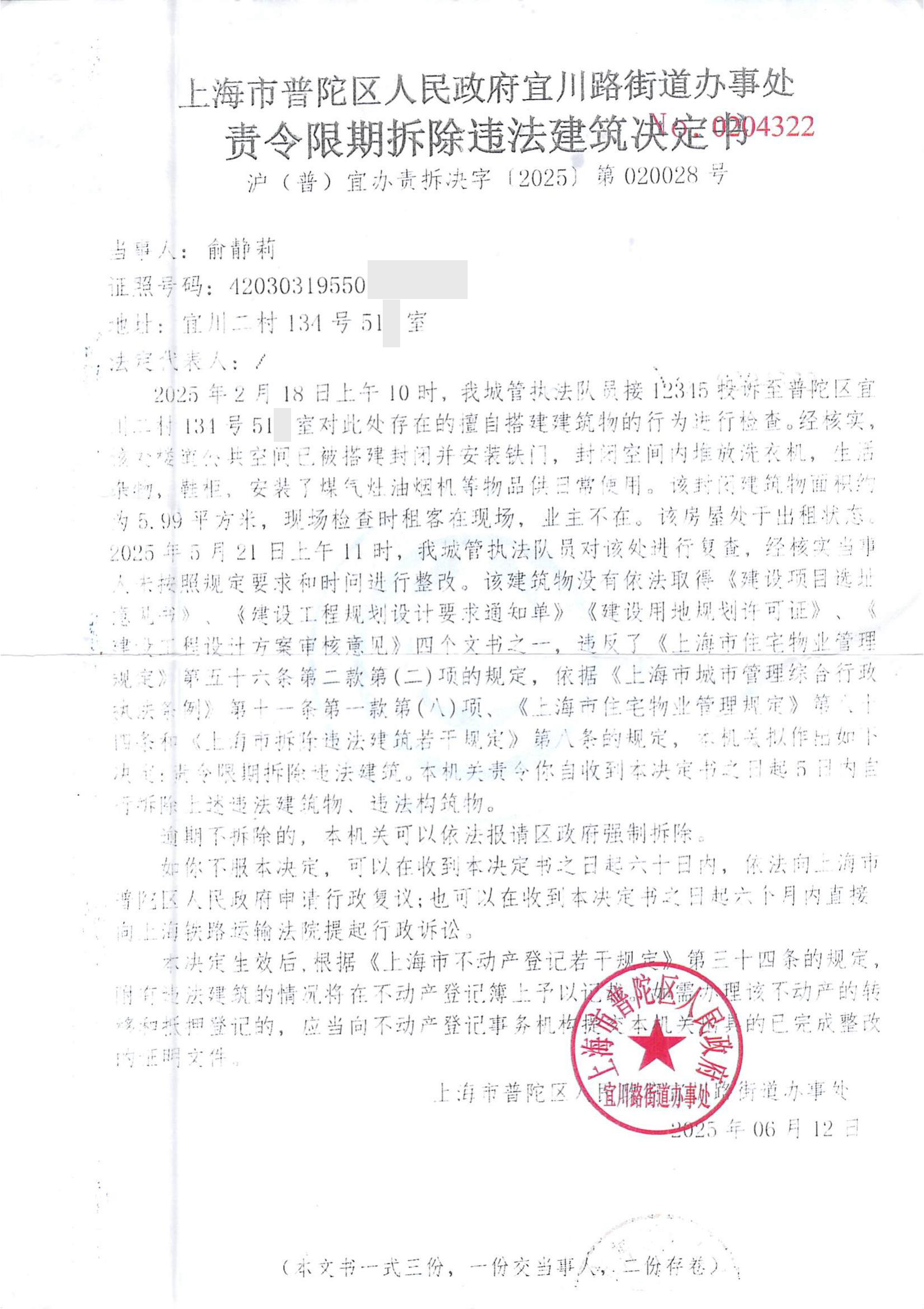 附件:《上海市普陀区人民政府宜川路街道办事处责令限期拆除违法建筑决定书》(沪(普)宜办责拆决字〔2025〕第020028号)