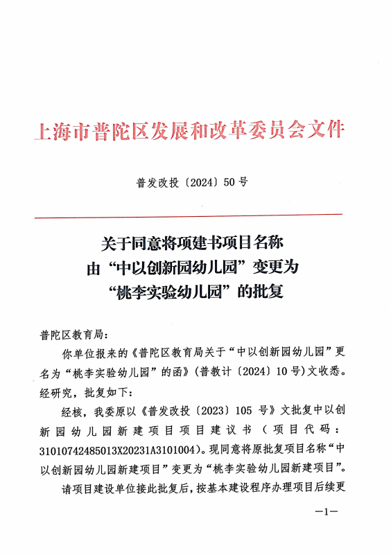 你单位报来的《普陀区教育局关于“中以创新园幼儿园”更名为“桃李实验幼儿园”的函》(普教计〔2024〕10号)文收悉。经研究,批复如下: