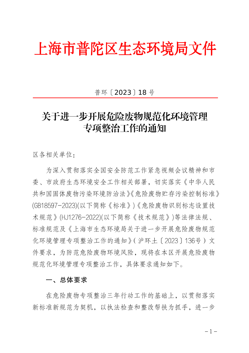 为深入贯彻落实全国安全防范工作紧急视频会议精神和市委、市政府生态环境安全工作相关部署,切实落实《中华人民共和国固体废物污染环境防治法》《危险废物贮存污染控制标准》(GB18597-2023)(以下简称《标准》)《危险废物识别标志设置技术规范》(HJ1276-2022)(以下简称《技术规范》)等法律法规、标准规范及《上海市生态环境局关于进一步开展危险废物规范化环境管理专项整治工作的通知》(沪环土〔2023〕136号)文件要求,为防范危险废物环境风险,现将在本区开展危险废物规范化环境管理专项整治工作,具体要求通知如下。