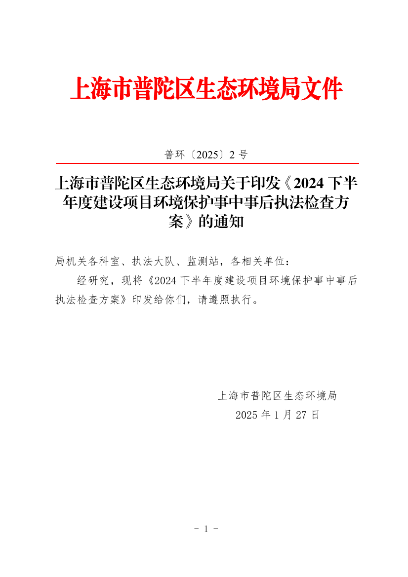 上海市普陀区生态环境局关于印发《2024下半年度建设项目环境保护事中事后执法检查方案》的通知