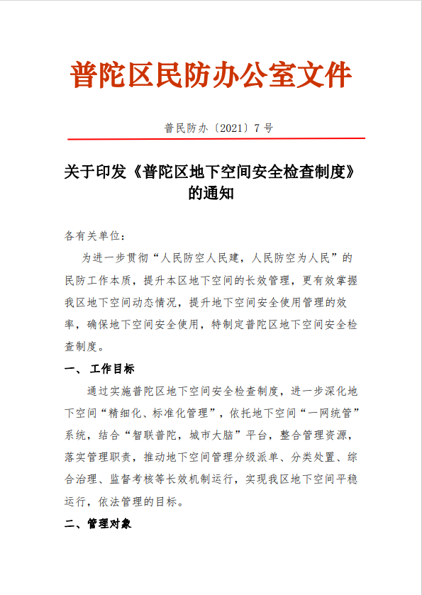 为进一步贯彻“人民防空人民建,人民防空为人民”的民防工作本质,提升本区地下空间的长效管理,更有效掌握我区地下空间动态情况,提升地下空间安全使用管理的效率,确保地下空间安全使用,特制定普陀区地下空间安全检查制度。