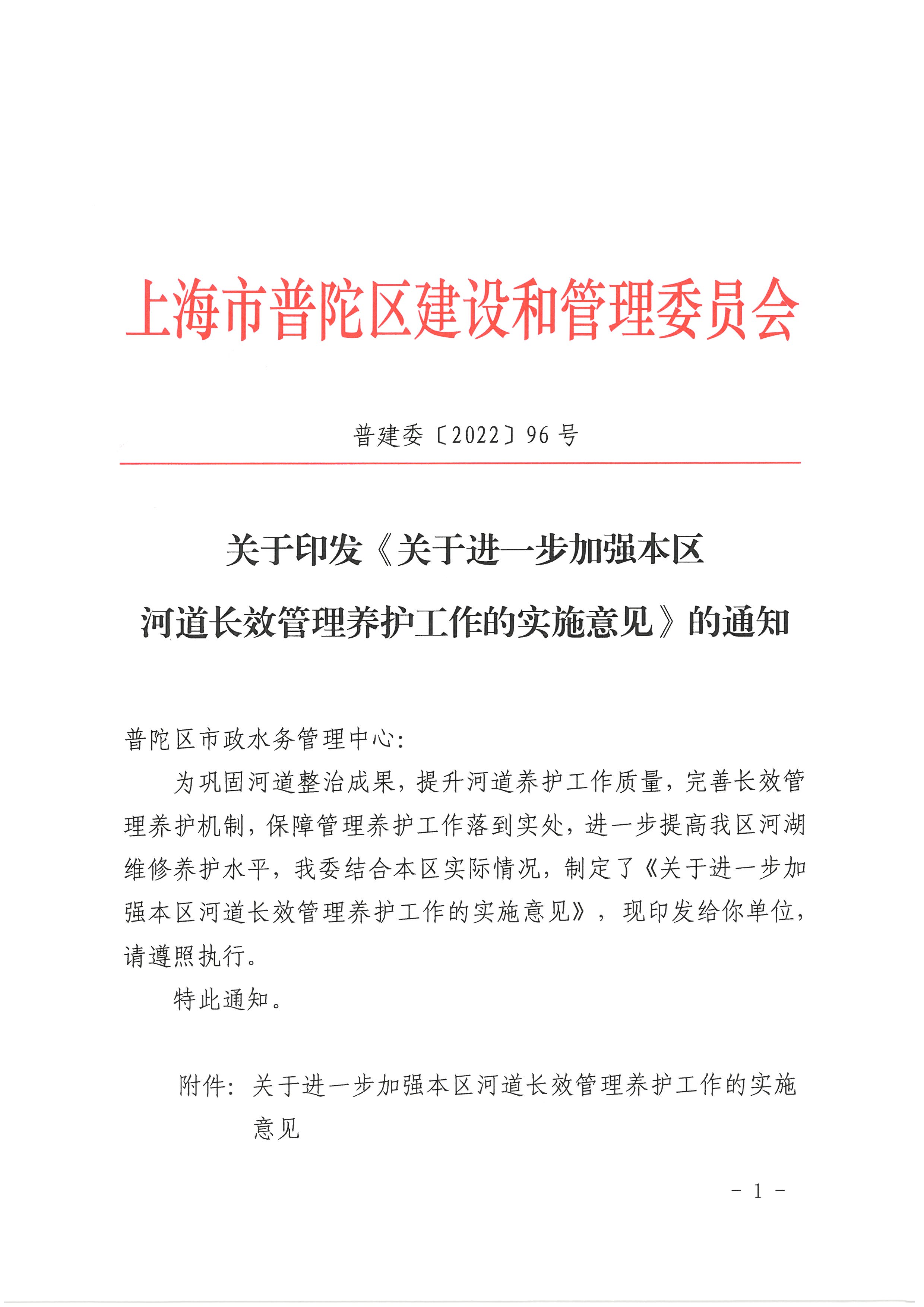 关于印发《关于进一步加强本区河道长效管理养护工作的实施意见》的通知