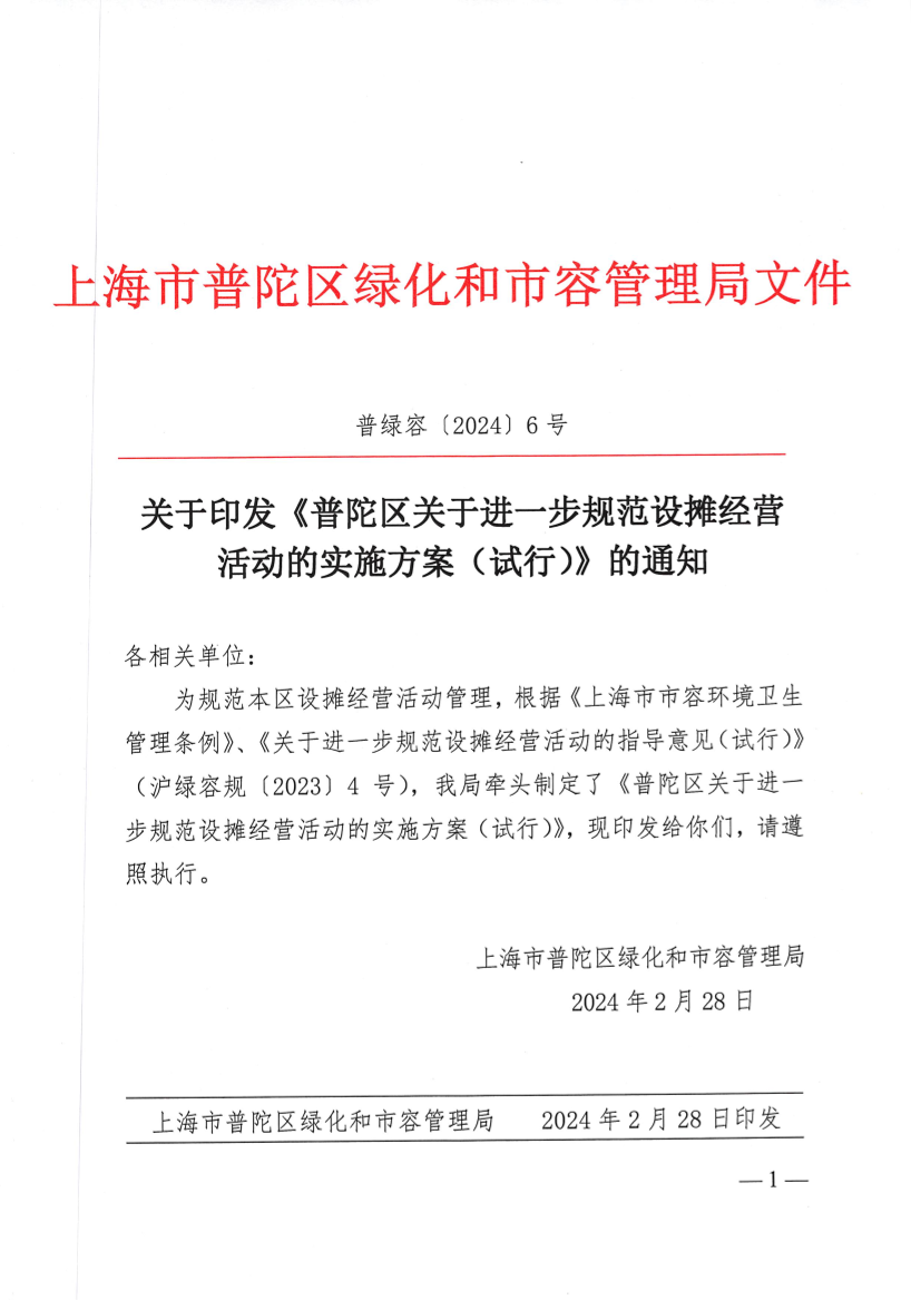 关于印发《普陀区关于进一步规范设摊经营活动的实施方案(试行)》的通知