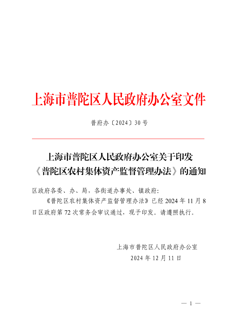 《普陀区农村集体资产监督管理办法》已经2024年11月8日区政府第72次常务会审议通过,现予印发。请遵照执行。