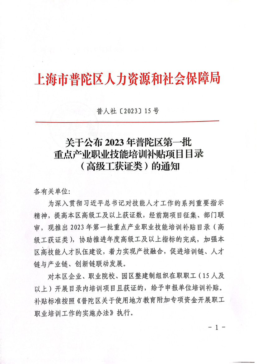 关于公布2023年普陀区第一批重点产业职业技能培训补贴项目目录(高级工获证类)的通知
