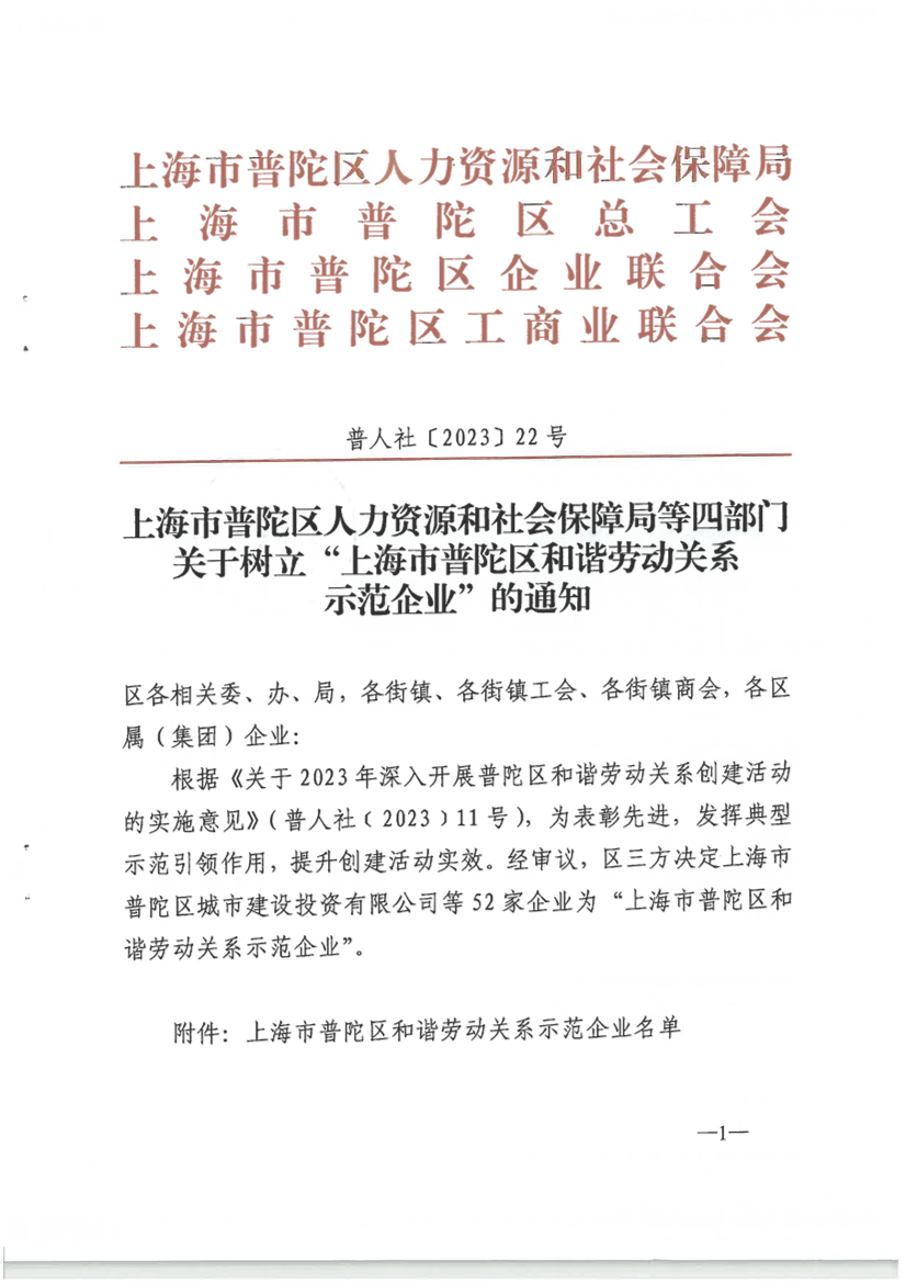 根据《关于2023年深入开展普陀区和谐劳动关系创建活动的实施意见》(普人社﹝2023﹞11号),为表彰先进,发挥典型示范引领作用,提升创建活动实效。经审议,区三方决定上海市普陀区城市建设投资有限公司等52家企业为“上海市普陀区和谐劳动关系示范企业”。