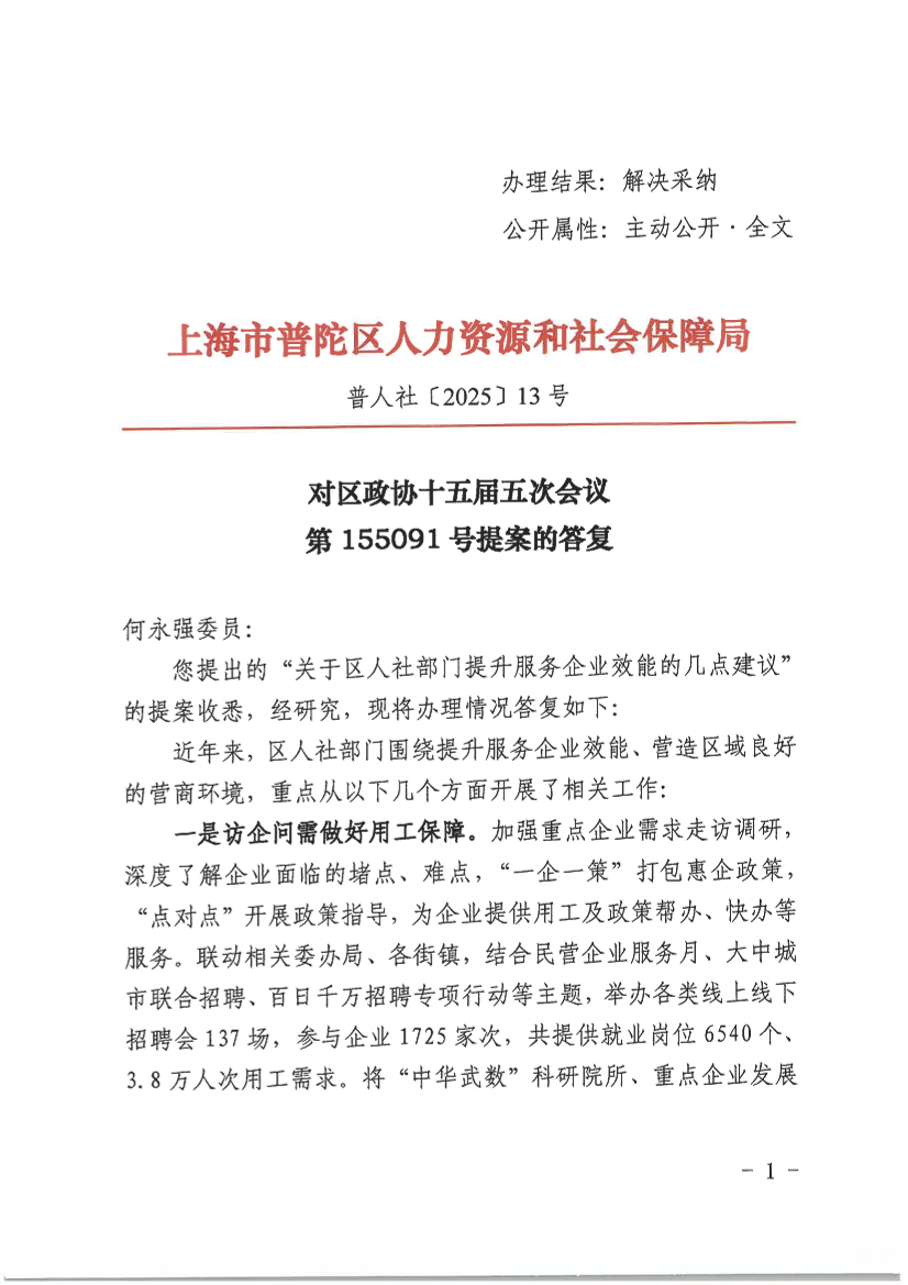 您提出的“关于区人社部门提升服务企业效能的几点建议”的提案收悉,经研究,现将办理情况答复如下: