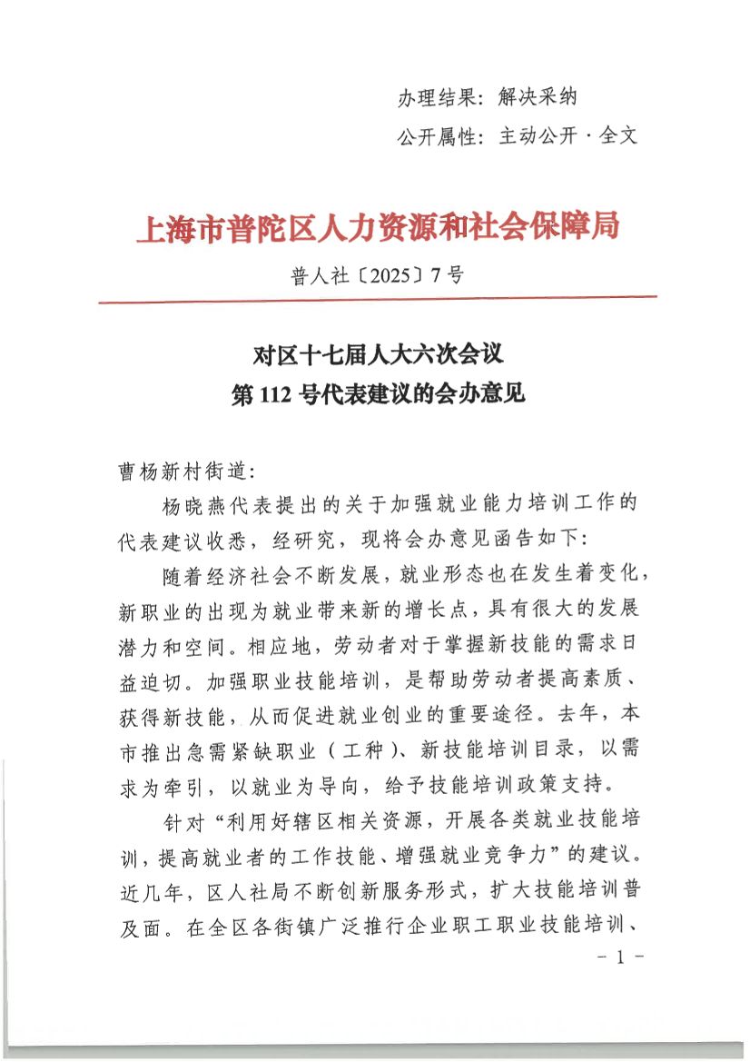 针对“利用好辖区相关资源,开展各类就业技能培训,提高就业者的工作技能、增强就业竞争力”的建议。近几年,区人社局不断创新服务形式,扩大技能培训普及面。在全区各街镇广泛推行企业职工职业技能培训、企业新型学徒制、等级工等培训项目,帮助企业、劳动者获得技能培训。依托“15分钟就业服务圈”开展社区特色培训,将优质培训配送到家门口、楼宇内,帮助劳动者零距离获得技能新体验,拓宽就业路径、提高就业能力。2024年全区共开展特色培训19场,惠及学员近600人次,其中曹杨街道涉及2场;同步开展“技能点亮美好生活—技能大师社区公益行”活动,组织技能大师工作室带头人、首席技师和技术能手进社区,将技能知识送到社区居民的身边。