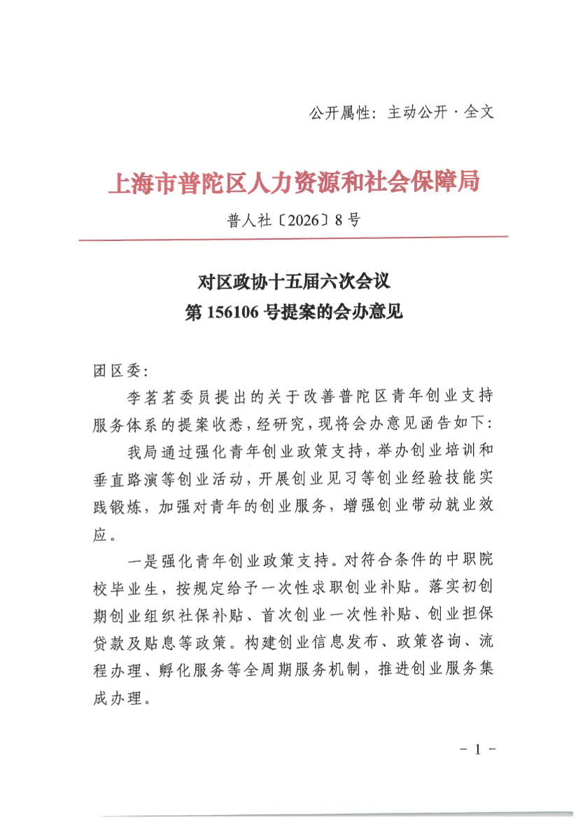 李茗茗委员提出的关于改善普陀区青年创业支持服务体系的提案收悉,经研究,现将会办意见函告如下: