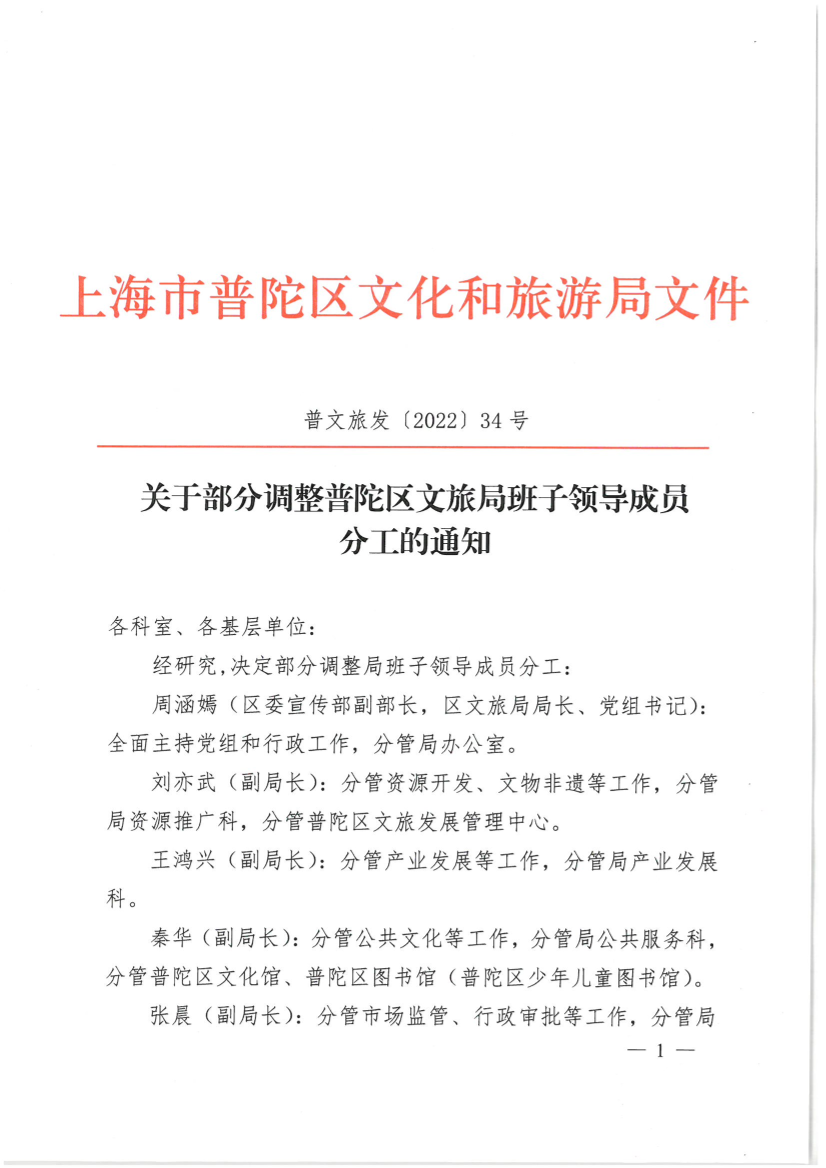 刘亦武(副局长):分管资源开发、文物非遗等工作,分管局资源推广科,分管普陀区文旅发展管理中心。