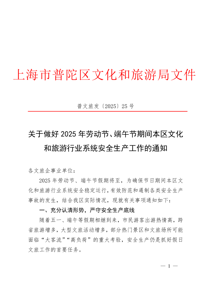 2025年劳动节、端午节假期将至,为确保节日期间本区文化和旅游行业系统安全稳定运行,有效防范和遏制各类安全生产事故的发生,结合我区实际情况,现就有关事项通知如下: