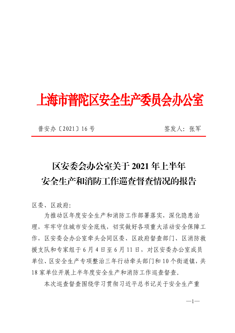 区安委会办公室关于2021年上半年 安全生产和消防工作巡查督查情况的报告