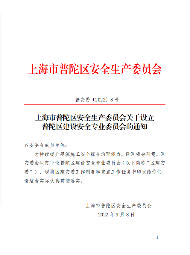 为贯彻落实市建安委关于我市建筑施工安全管理相关部署要求,切实加强普陀区建设安全专业委员会(以下简称“区建安委”)的组织领导,推动区建安委各成员单位及相关职能部门齐抓共管,全力降压我区建筑施工事故数,持续提升建筑施工安全综合治理能力,进一步促进普陀区建设行业安全形势稳定向好发展,经普陀区安全生产委员会(以下简称“区安委会”)同意,建立区建设安全专业委员会工作制度。