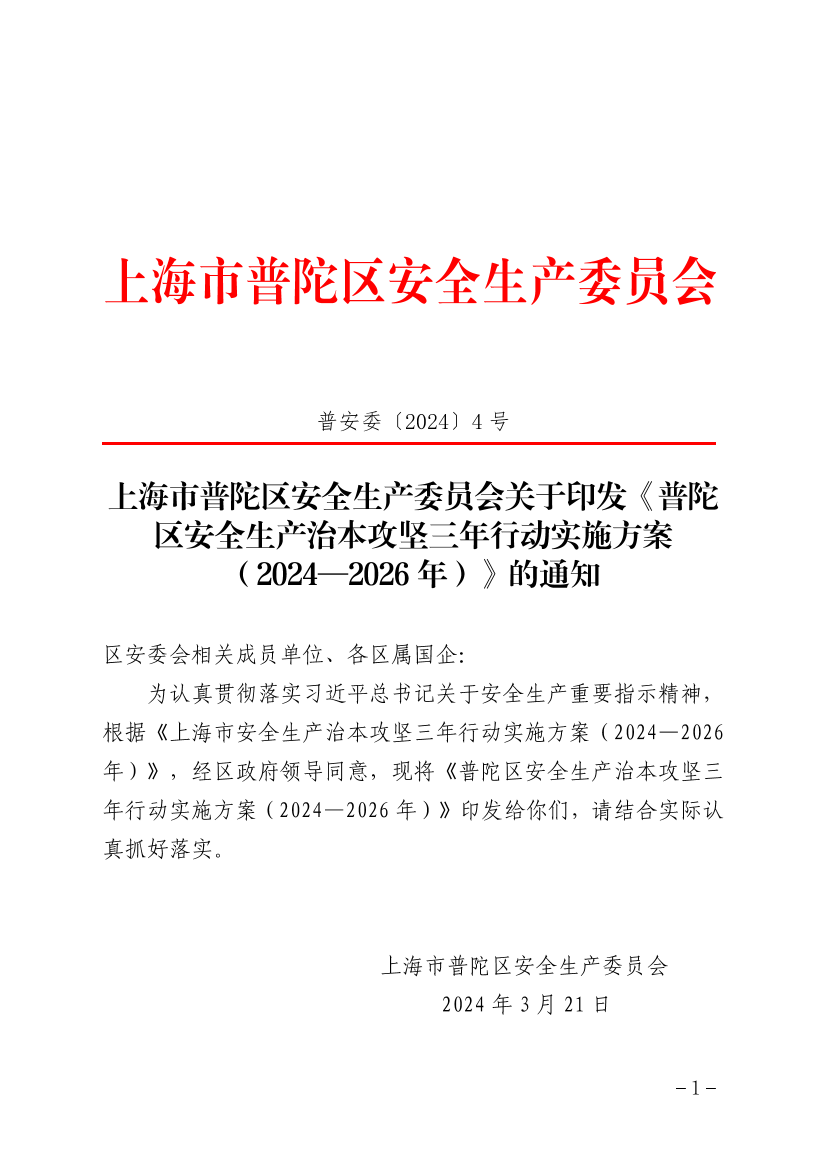 为认真贯彻落实习近平总书记关于安全生产重要指示精神,根据《上海市安全生产治本攻坚三年行动实施方案(2024—2026年)》,经区政府领导同意,现将《普陀区安全生产治本攻坚三年行动实施方案(2024—2026年)》印发给你们,请结合实际认真抓好落实。