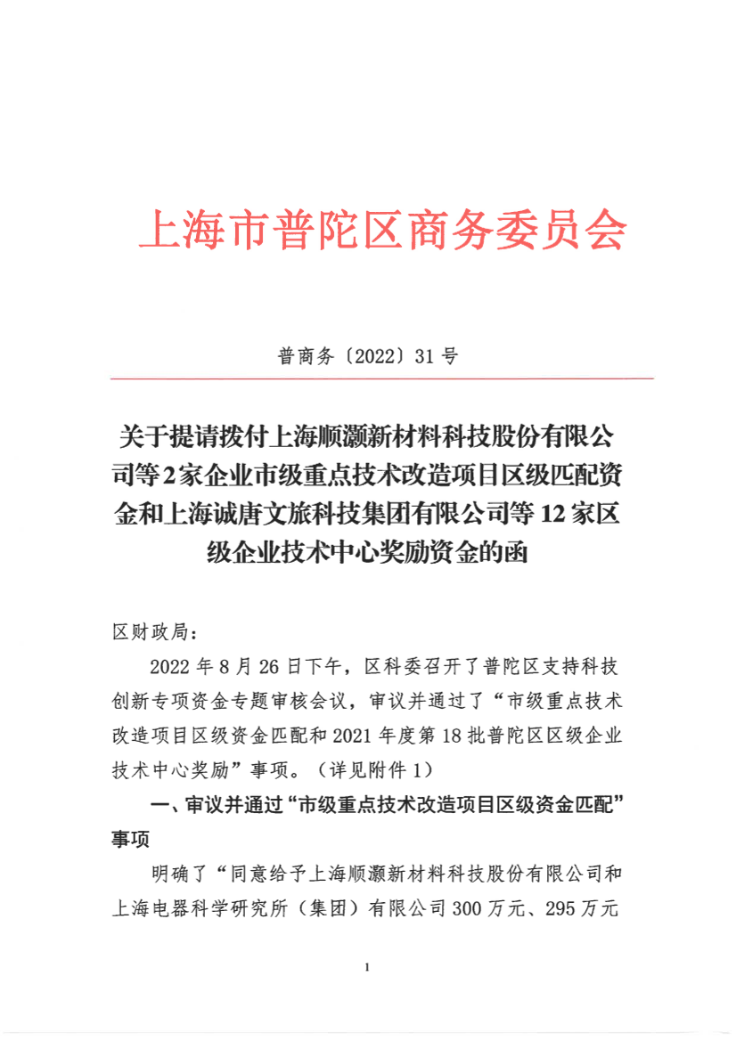 关于提请拨付上海顺灏新材料科技股份有限公司等2家企业市级重点技术改造项目区级匹配资金和上海诚唐文旅科技集团有限公司等12家区级企业技术中心奖励资金的函