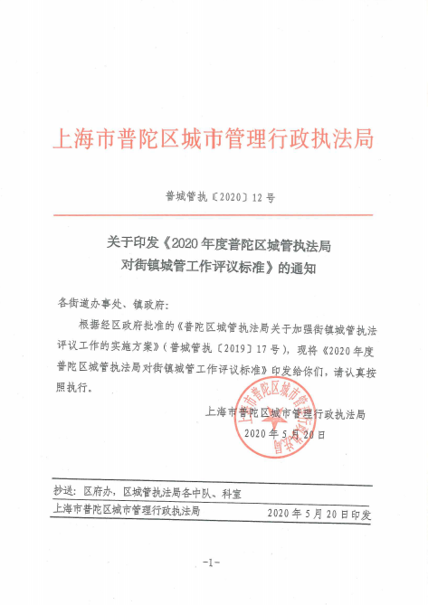 关于印发《2020年度普陀区城管执法局对街镇城管工作评议标准》的通知