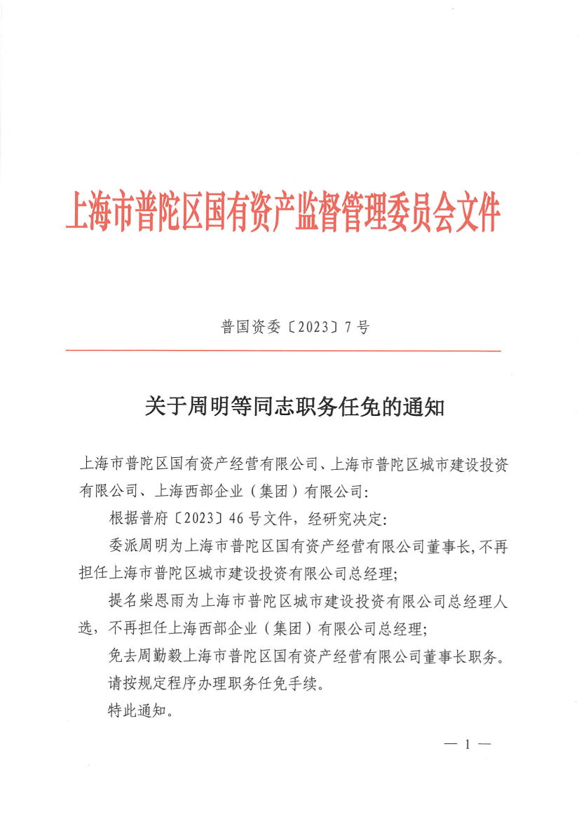 委派周明为上海市普陀区国有资产经营有限公司董事长,不再担任上海市普陀区城市建设投资有限公司总经理;