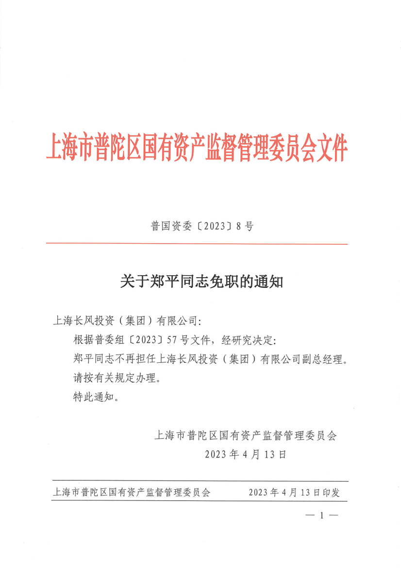 郑平同志不再担任上海长风投资(集团)有限公司副总经理。