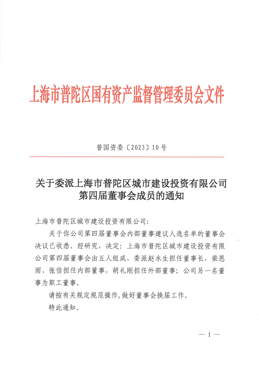 关于委派上海市普陀区城市建设投资有限公司第四届董事会成员的通知
