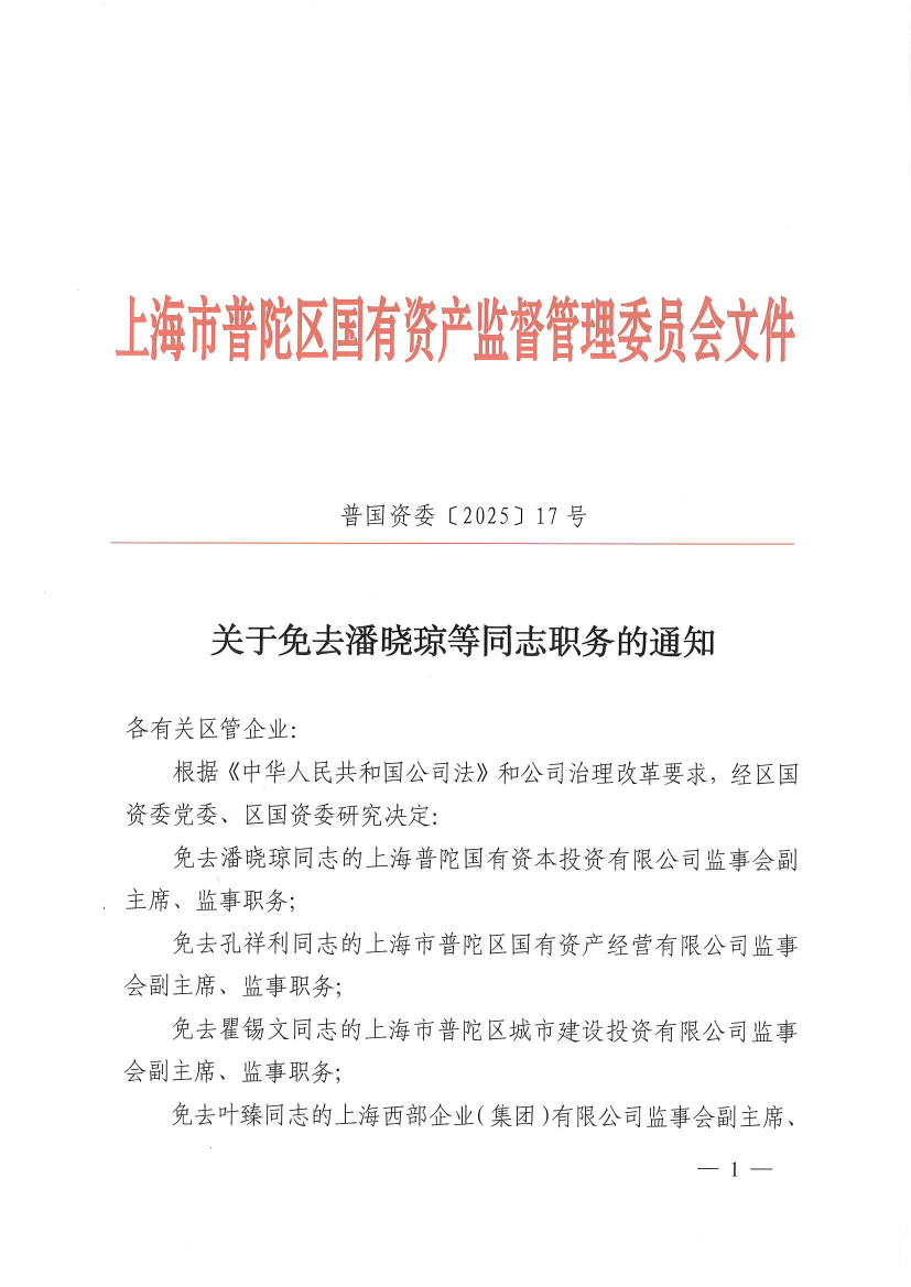 免去潘晓琼同志的上海普陀国有资本投资有限公司监事会副主席、监事职务;