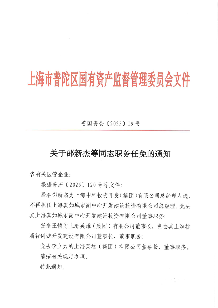 任命王慎为上海英雄(集团)有限公司董事长,免去其上海桃浦智创城开发建设有限公司董事长、董事职务;