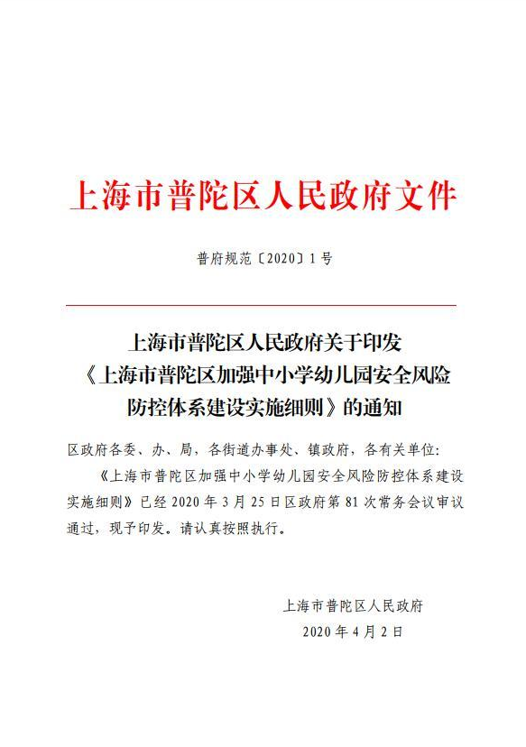 《上海市普陀区加强中小学幼儿园安全风险防控体系建设实施细则》已经2020年3月25日区政府第81次常务会议审议通过,现予印发。请认真按照执行。