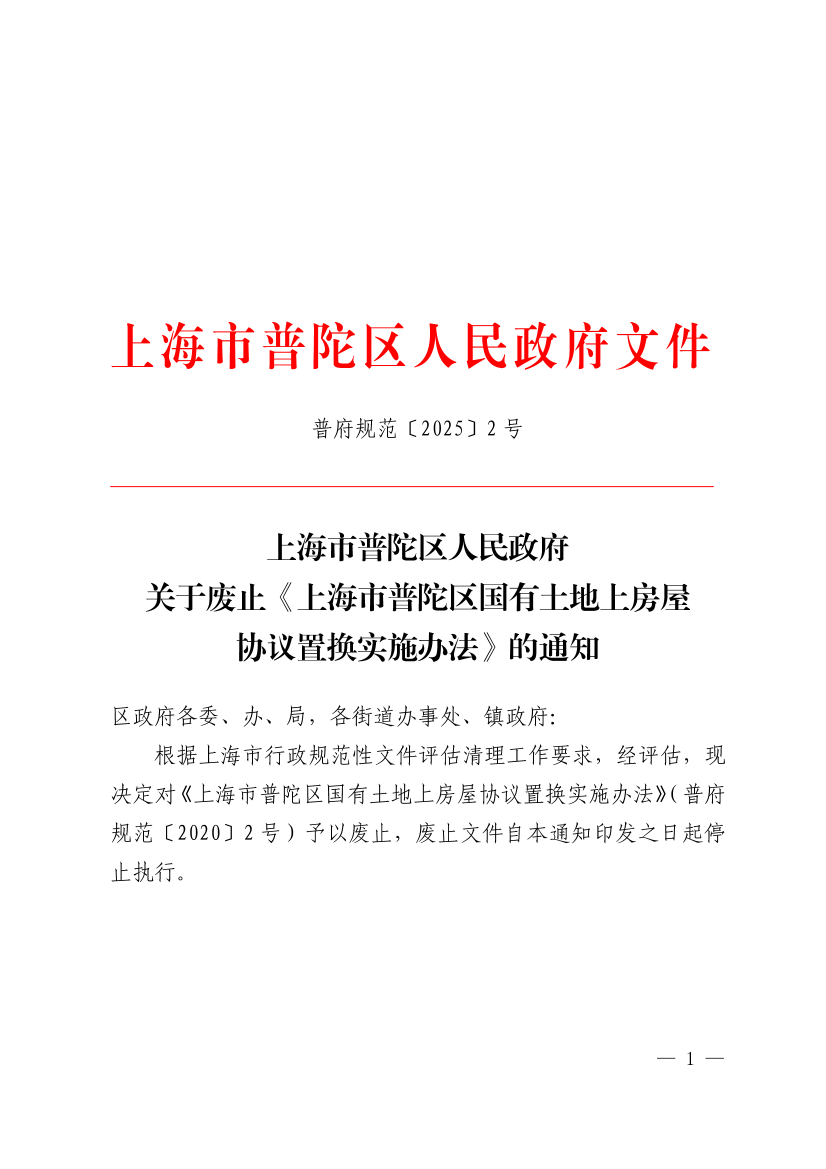 根据上海市行政规范性文件评估清理工作要求,经评估,现决定对《上海市普陀区国有土地上房屋协议置换实施办法》(普府规范〔2020〕2号)予以废止,废止文件自本通知印发之日起停止执行。