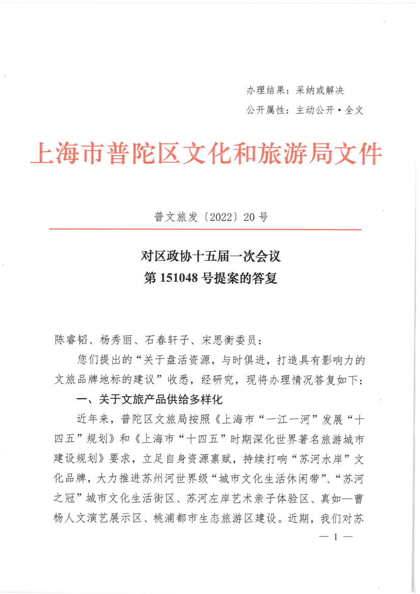 对区政协十五届一次会议第151048号提案的答复