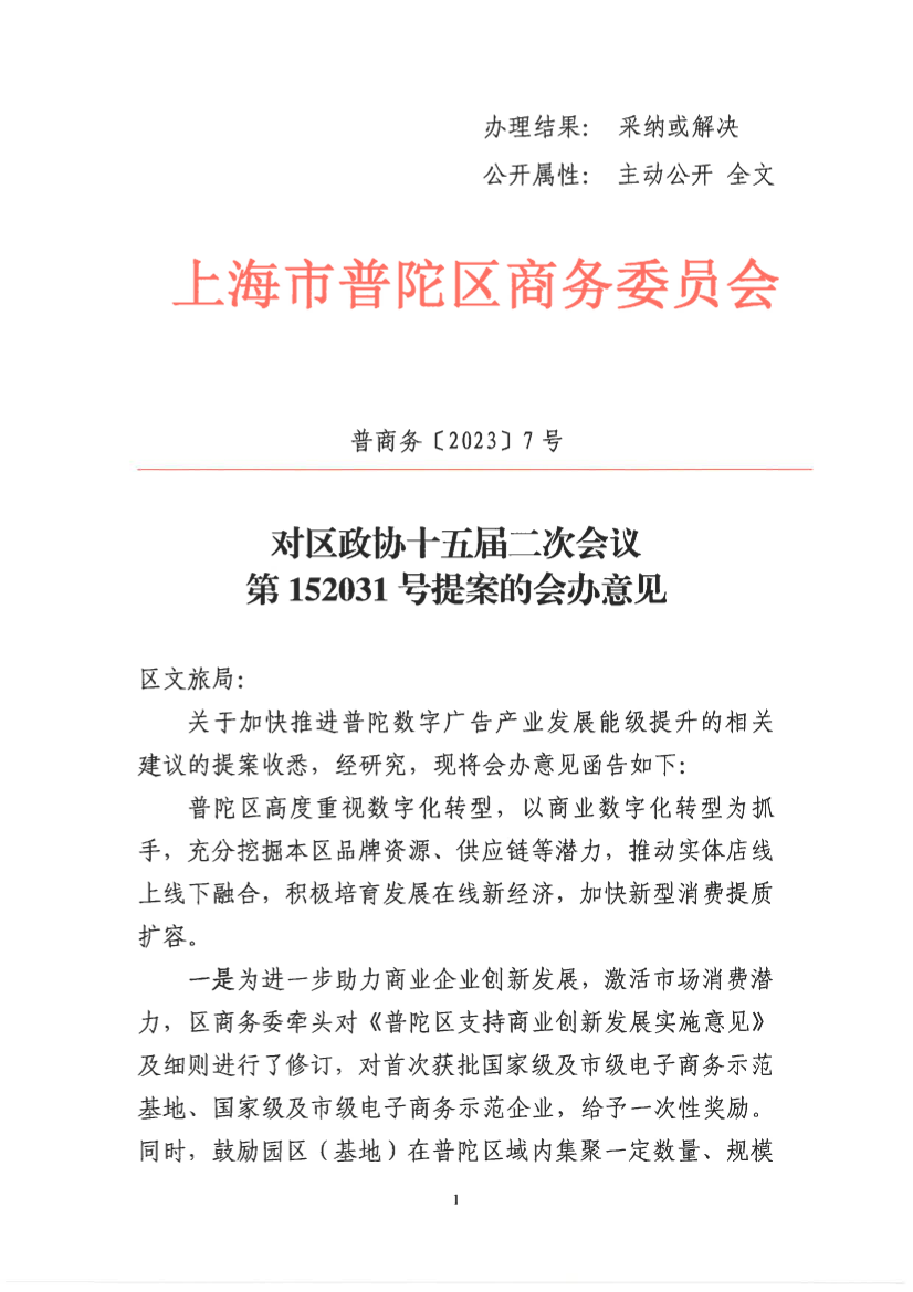 关于加快推进普陀数字广告产业发展能级提升的相关建议的提案收悉,经研究,现将会办意见函告如下: