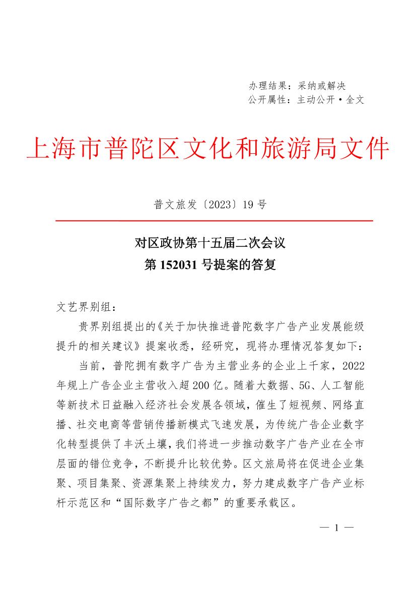 贵界别组提出的《关于加快推进普陀数字广告产业发展能级提升的相关建议》提案收悉,经研究,现将办理情况答复如下:
