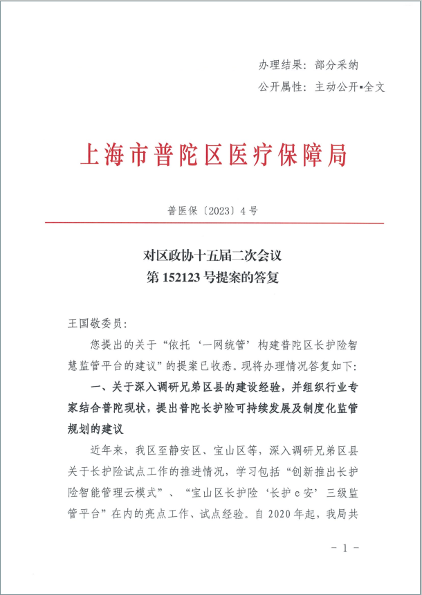 您提出的关于“依托‘一网统管’构建普陀区长护险智慧监管平台的建议”的提案已收悉。现将办理情况答复如下:
