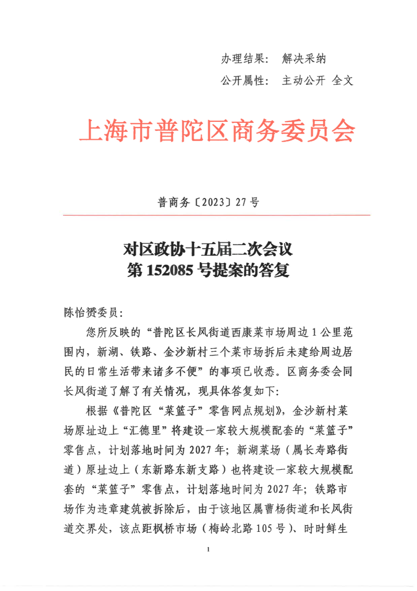 您所反映的“普陀区长风街道西康菜市场周边1公里范围内,新湖、铁路、金沙新村三个菜市场拆后未建给周边居民的日常生活带来诸多不便”的事项已收悉。区商务委会同长风街道了解了有关情况,现具体答复如下: