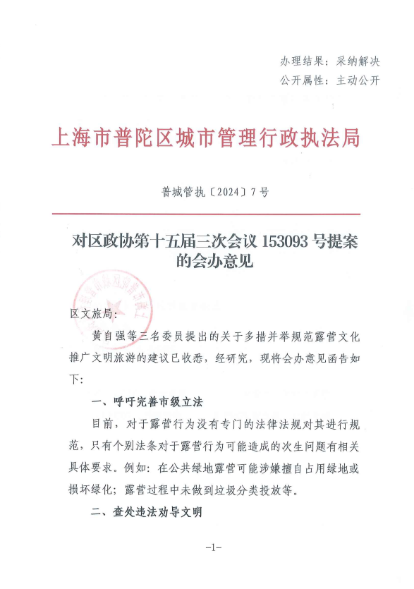 黄自强等三名委员提出的关于多措并举规范露营文化推广文明旅游的建议已收悉,经研究,现将会办意见函告如下:
