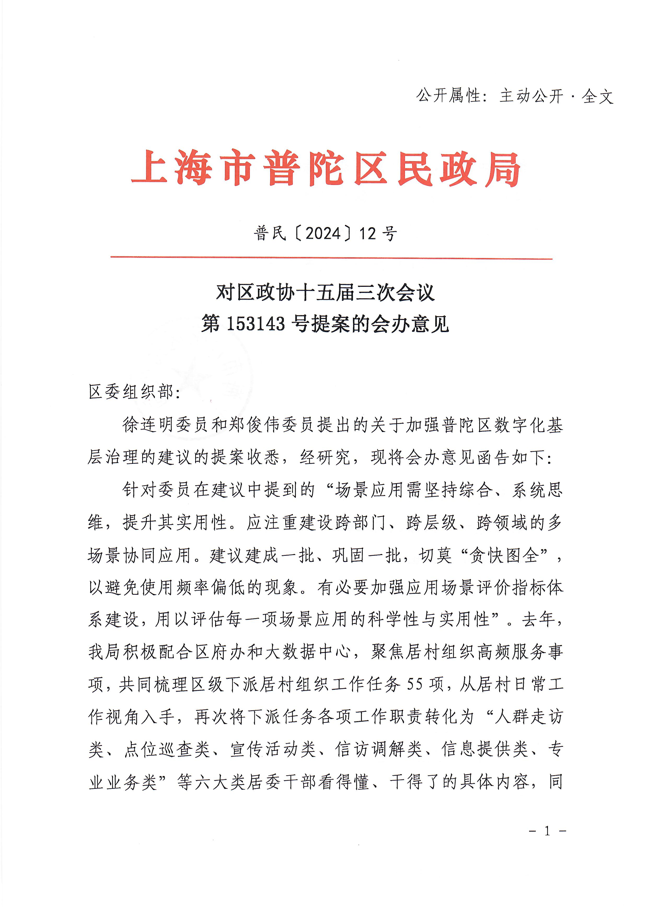 徐连明委员和郑俊伟委员提出的关于加强普陀区数字化基层治理的建议的提案收悉,经研究,现将会办意见函告如下: