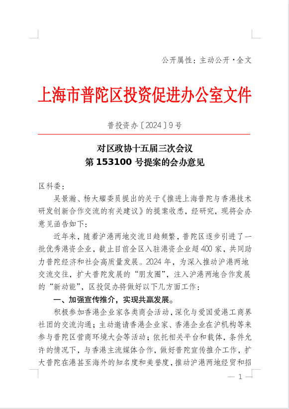 吴景瀚、杨大耀委员提出的关于《推进上海普陀与香港技术研发创新合作交流的有关建议》提案收悉,经研究,现将会办意见函告如下
