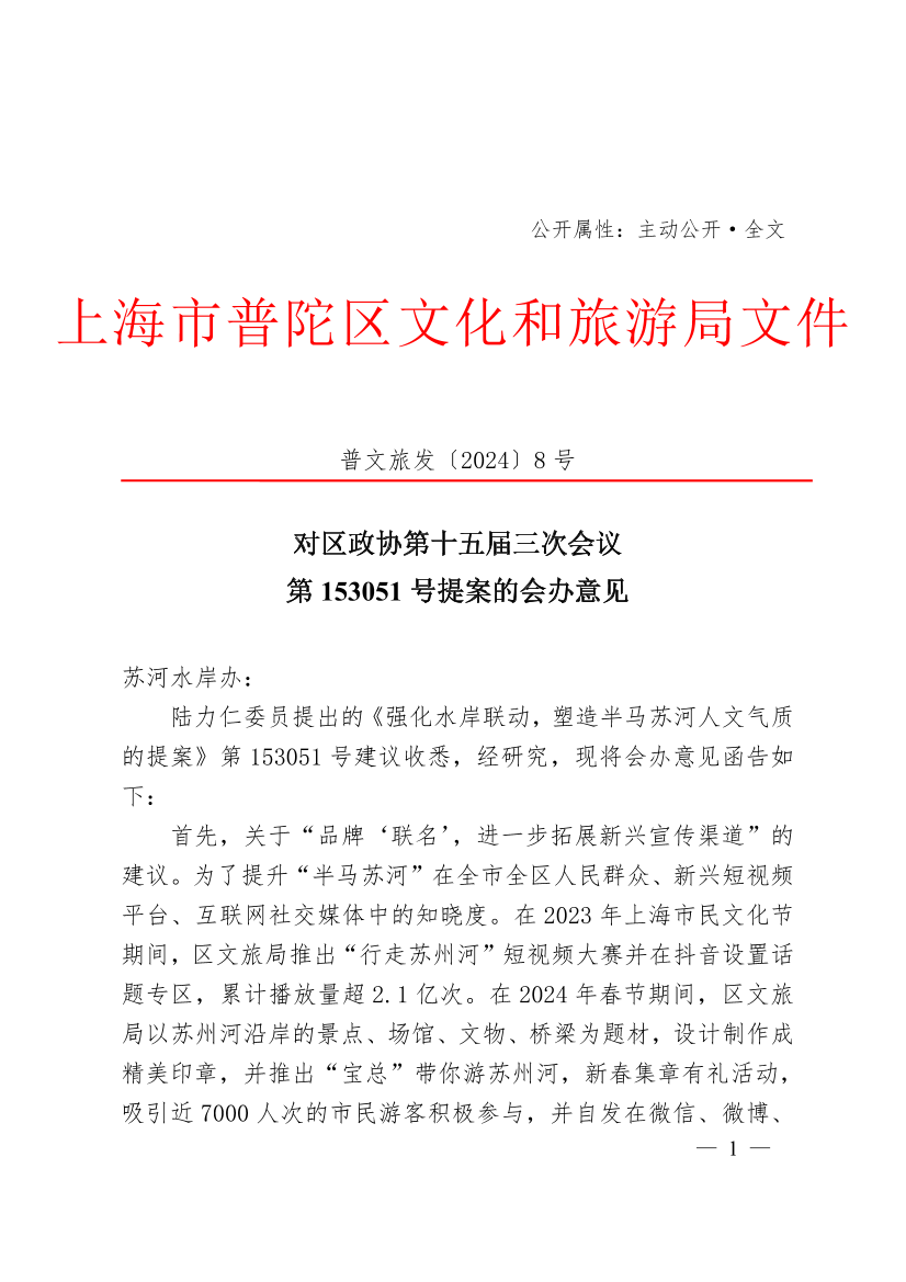 陆力仁委员提出的《强化水岸联动,塑造半马苏河人文气质的提案》第153051号建议收悉,经研究,现将会办意见函告如下: