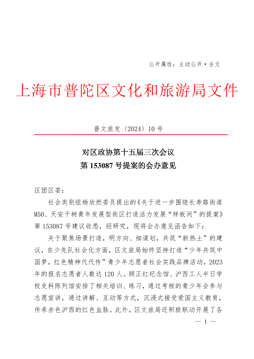 社会类别组杨欣然委员提出的《关于进一步围绕长寿路街道M50、天安千树青年发展型街区打造活力发展“样板间”的提案》第153087号建议收悉,经研究,现将会办意见函告如下: