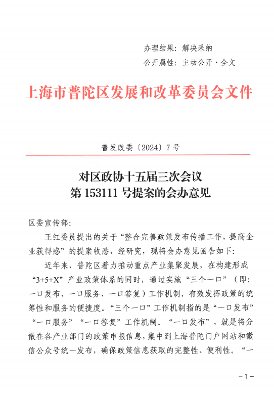 近年来,普陀区着力推动重点产业集聚发展,在构建形成“3+5+X”产业政策体系的同时,通过实施“三个一口”(即:一口发布、一口服务、一口答复)工作机制,有效发挥政策的统筹性和服务的便捷度。“三个一口”工作机制指的是“一口发布”“一口服务”“一口答复”工作机制。“一口发布”,就是将分散在各产业部门的政策申报信息,集中到上海普陀门户网站和微信公众号统一发布,确保政策信息获取的完整性、便利性。“一口服务”, 就是依托重点地区投促中心为申报单位提供扶持项目申请、形式审查等服务,并对部分较为重大、复杂事项提出扶持建议。“一口答复”,就是在企业提交政策申请后,由重点地区投促中心跟踪扶持项目申报情况、评审结果、资金拨付情况,统一向申报单位答复相关进度和结果。通过“三个一口”工作机制,把全区政策资源集中到服务企业的前沿一线,提高企业政策申请便利性,方便企业政策诉求“一口式”对接,发挥投促中心一线服务优势,把政策服务与招商稳商工作深度融合。
