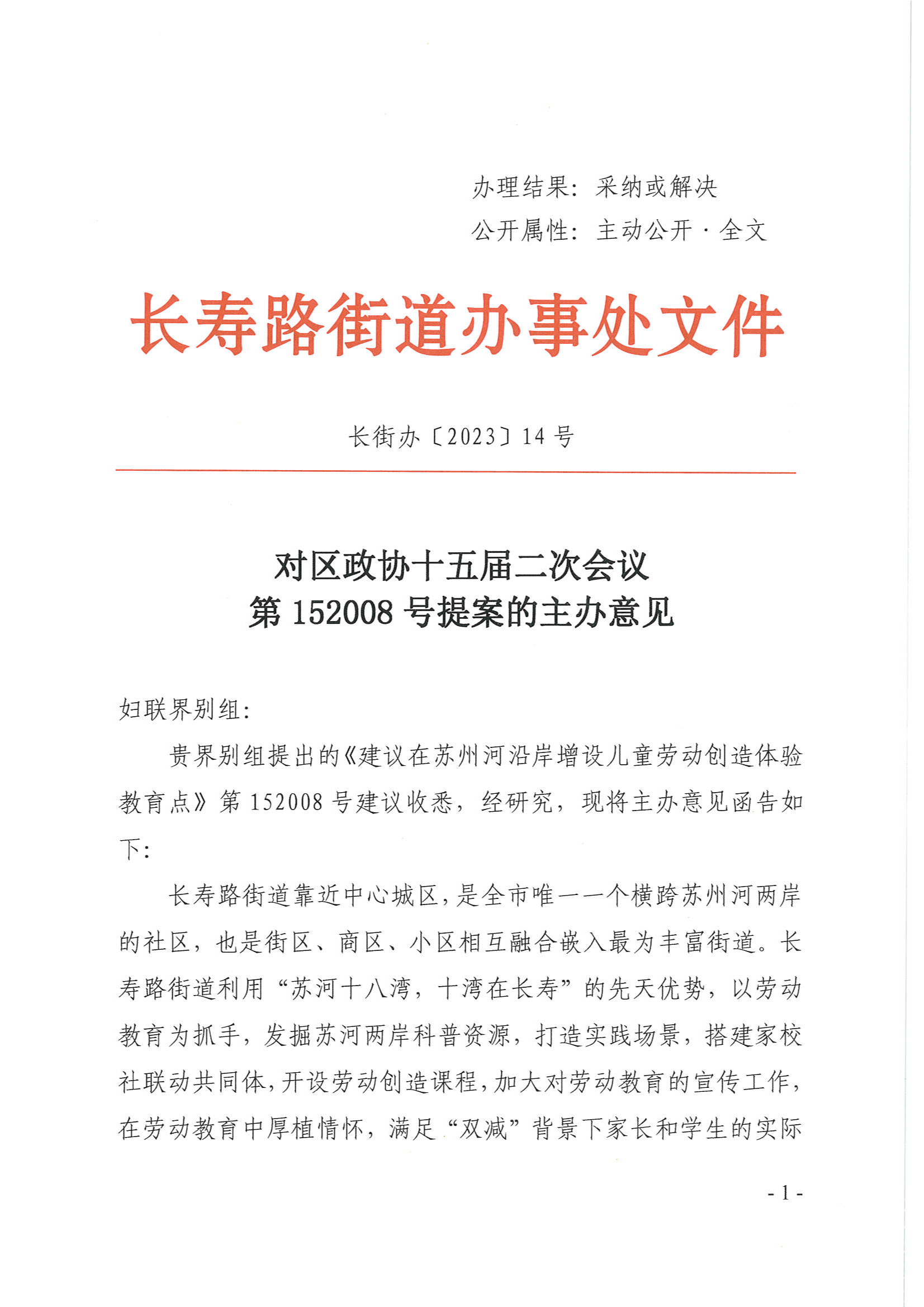 贵界别组提出的《建议在苏州河沿岸增设儿童劳动创造体验教育点》第152008号建议收悉,经研究,现将主办意见函告如下: