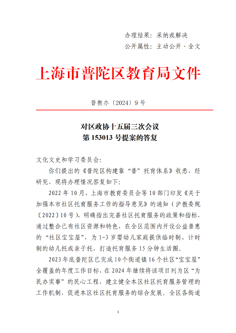 你们提出的《普陀区构建靠“普”托育体系》收悉,经研究,现将办理情况答复如下: