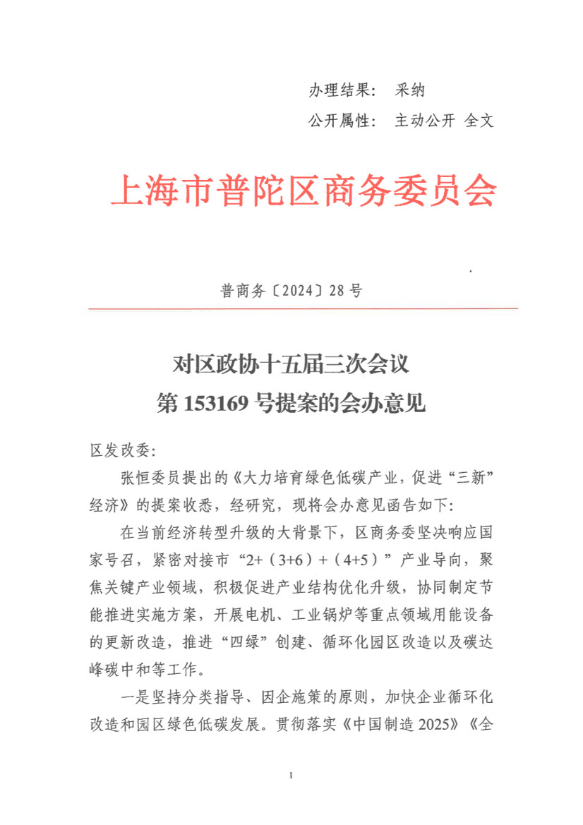 张恒委员提出的《大力培育绿色低碳产业,促进“三新”经济》的提案收悉,经研究,现将会办意见函告如下: