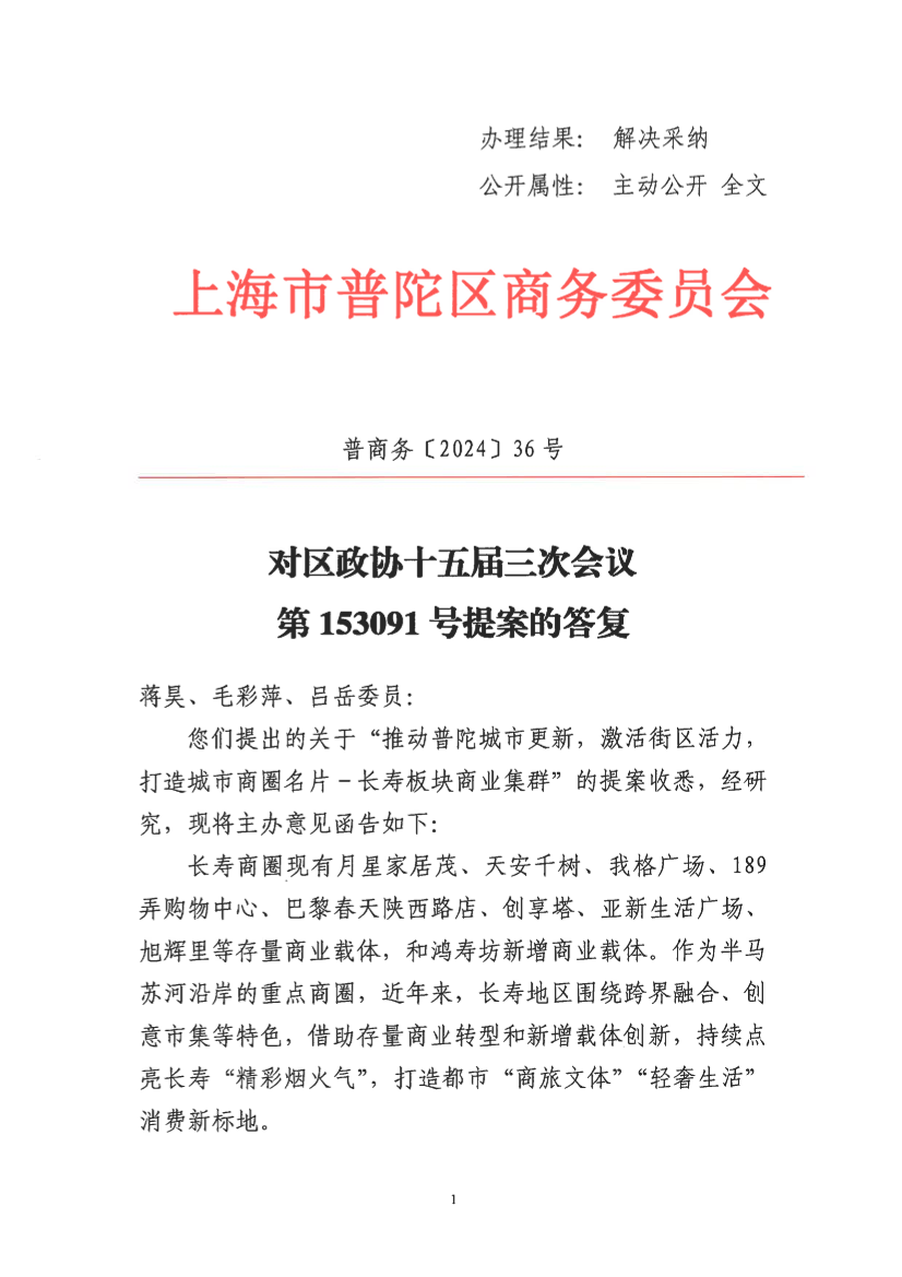 您们提出的关于“推动普陀城市更新,激活街区活力,打造城市商圈名片-长寿板块商业集群”的提案收悉,经研究,现将主办意见函告如下: