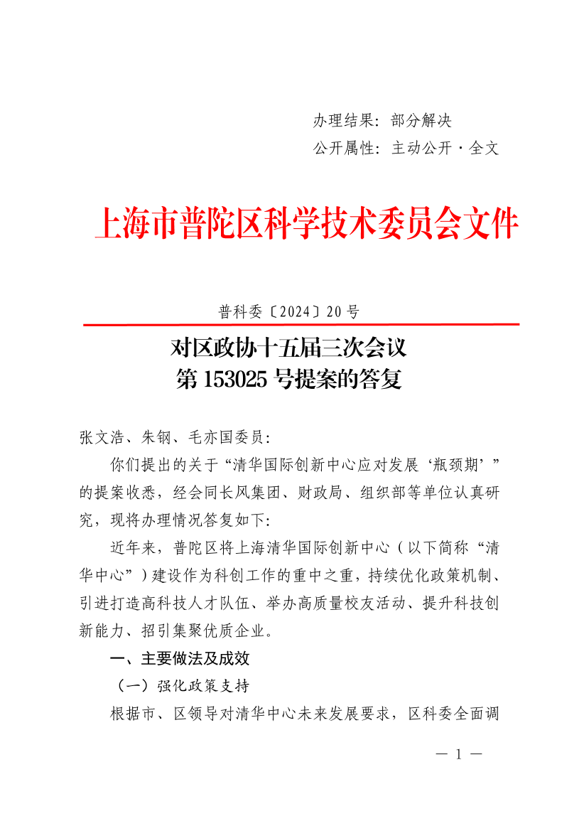 你们提出的关于“清华国际创新中心应对发展‘瓶颈期’”的提案收悉,经会同长风集团、财政局、组织部等单位认真研究,现将办理情况答复如下: