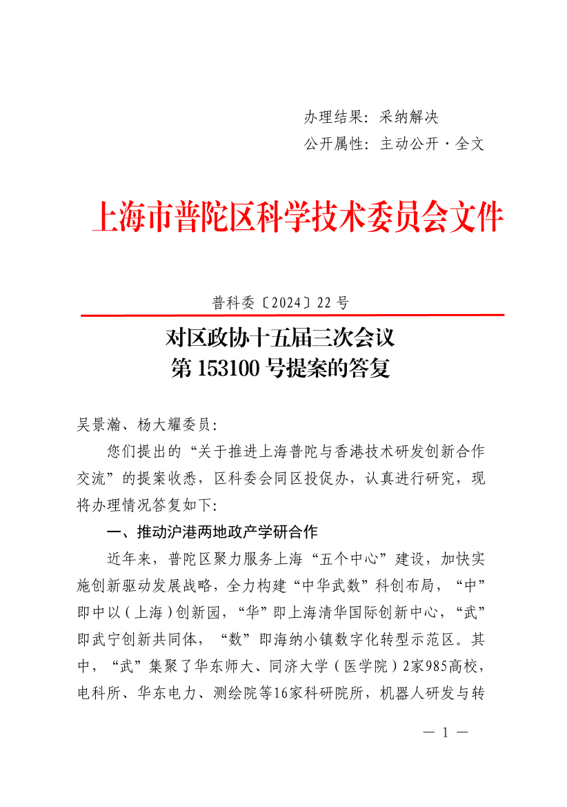 您们提出的“关于推进上海普陀与香港技术研发创新合作交流”的提案收悉,区科委会同区投促办,认真进行研究,现将办理情况答复如下: