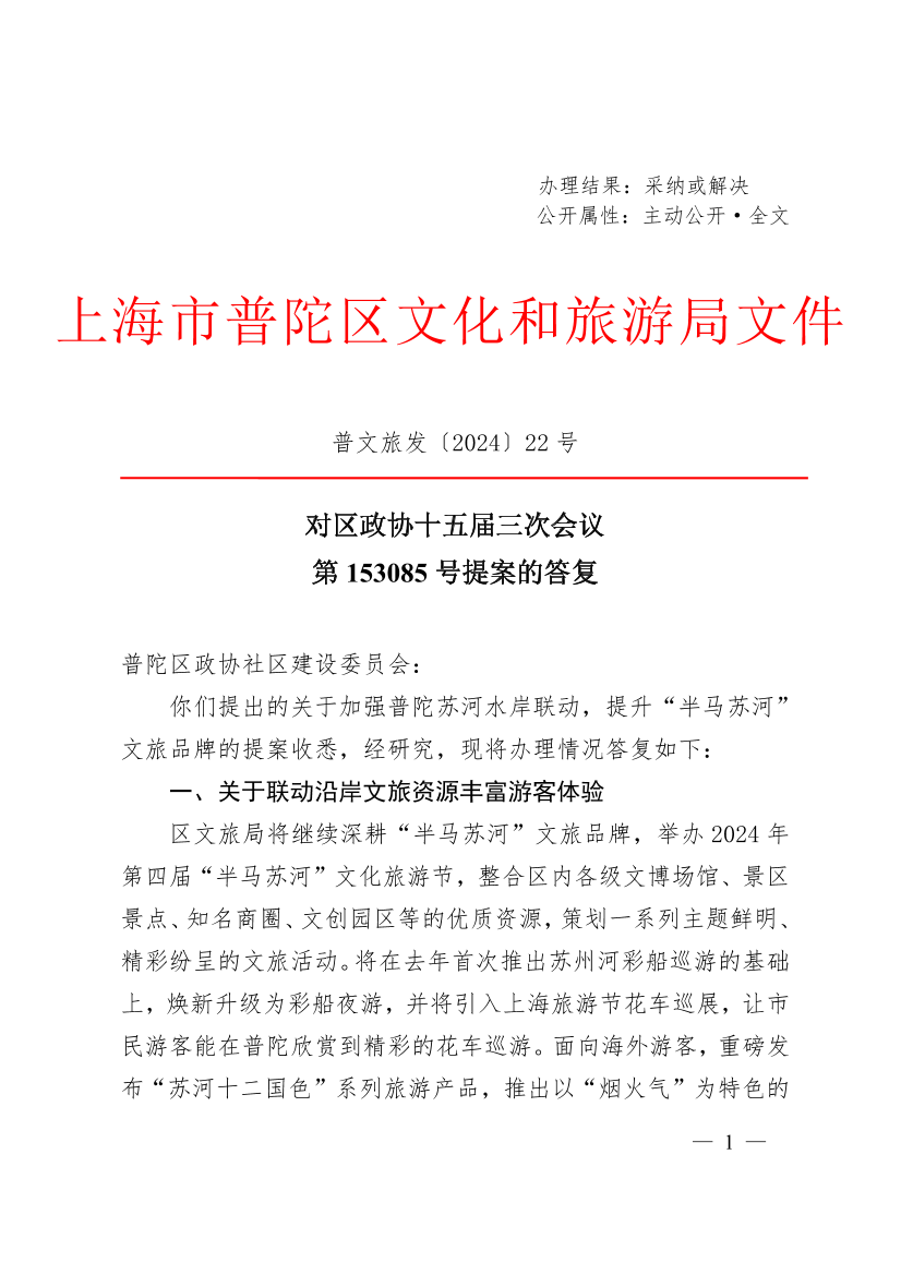 你们提出的关于加强普陀苏河水岸联动,提升“半马苏河”文旅品牌的提案收悉,经研究,现将办理情况答复如下: