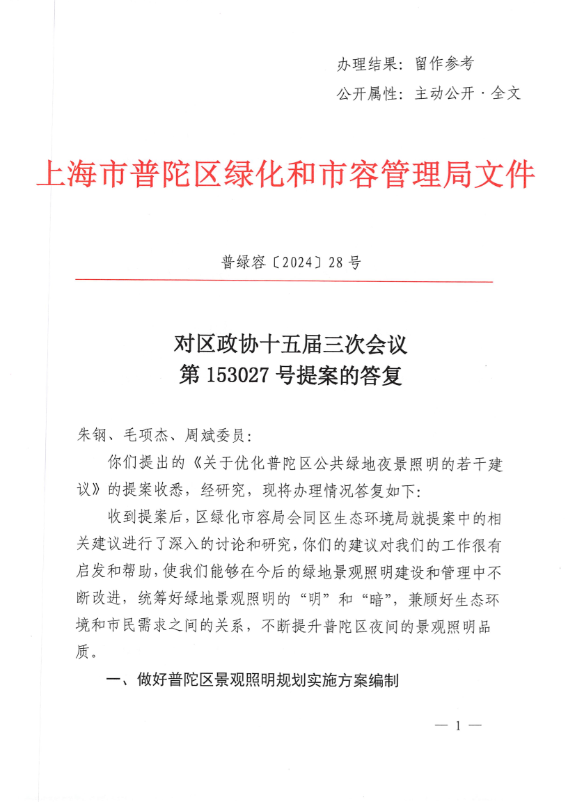 你们提出的《关于优化普陀区公共绿地夜景照明的若干建议》的提案收悉,经研究,现将办理情况答复如下: