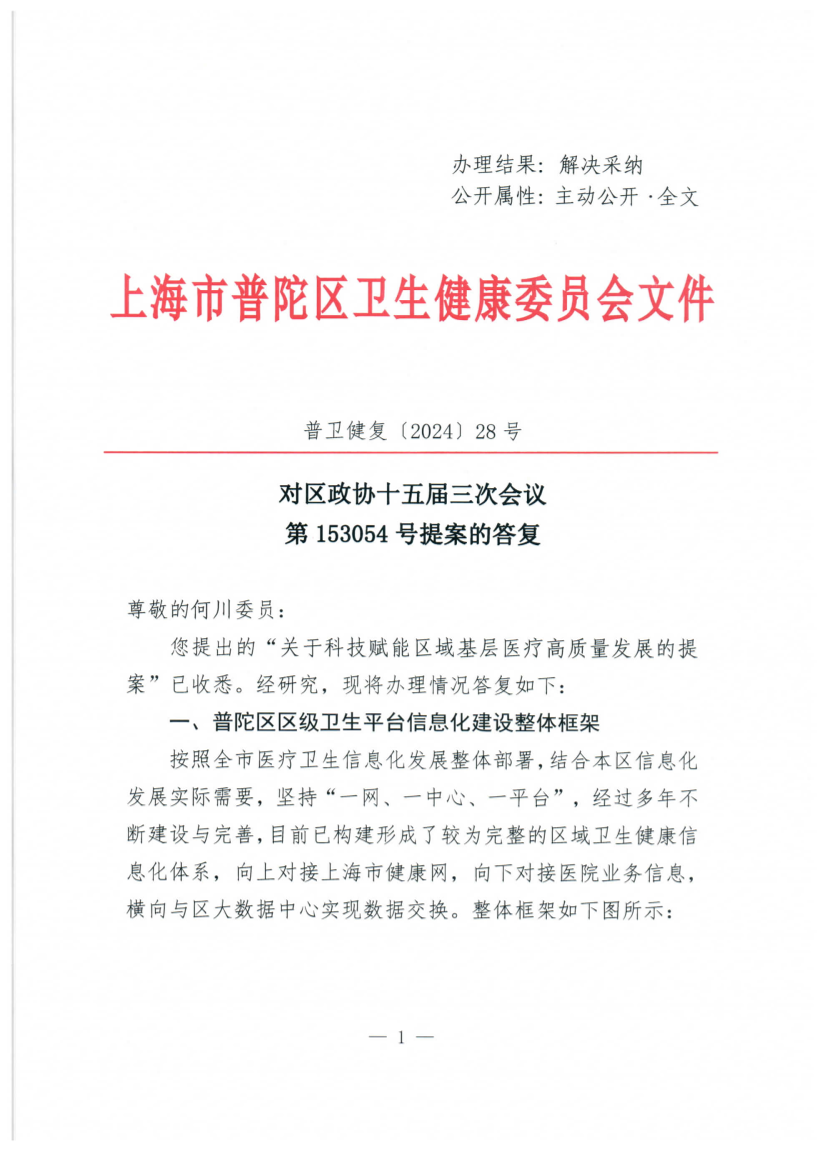 综上,近年来,在市卫生健康委统筹规划指导和区委、区政府领导下,普陀区域卫生信息化取得了阶段性成果。您的“关于科技赋能区域基层医疗高质量发展的提案”建议为普陀卫生健康事业的进一步发展指出了方向。下一步,我们将持续聚焦科技创新赋能医疗卫生事业,稳步推进优质医疗资源下沉基层,让人工智能技术成为医生的好帮手,在科技创新的助力下,实现医疗卫生事业高质量发展,让更多优质医疗资源造福更多人。